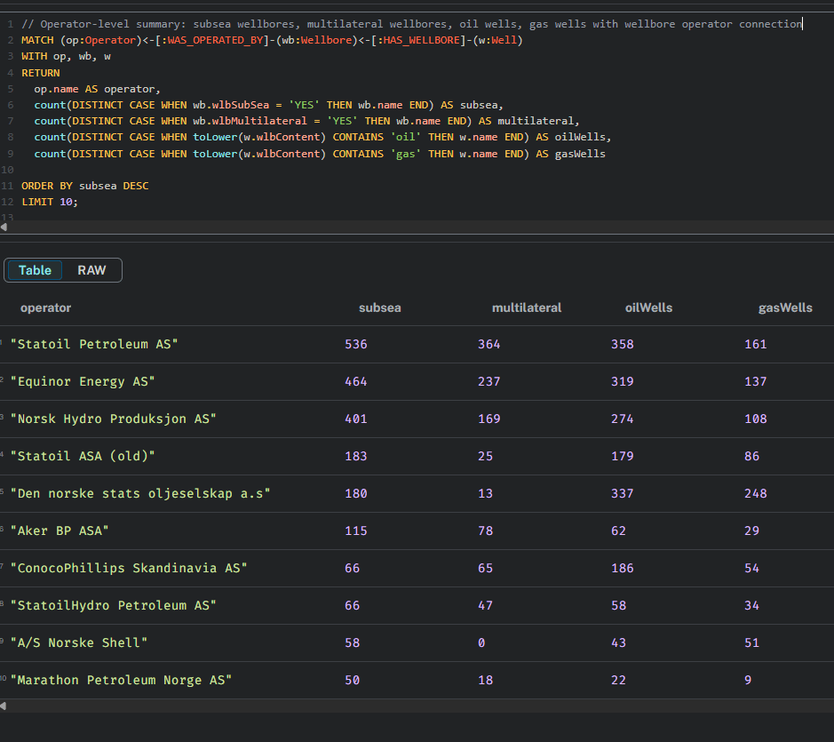 With this graph query, I can see each operator’s footprint: subsea & multilateral activity, and the balance between oil vs. gas wells (with connections).