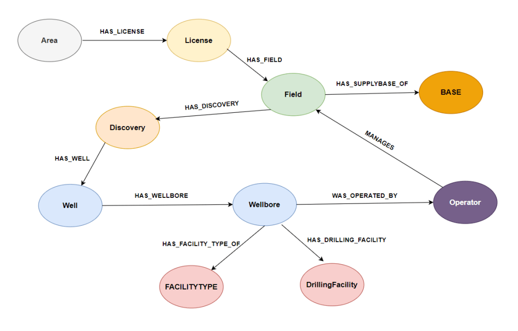 Relationships: HAS_LICENSE, HAS_FIELD, HAS_DISCOVERY, HAS_WELLBORE, WAS_OPERATED_BY, MANAGES, HAS_SUPPLYBASE_OF and more.
