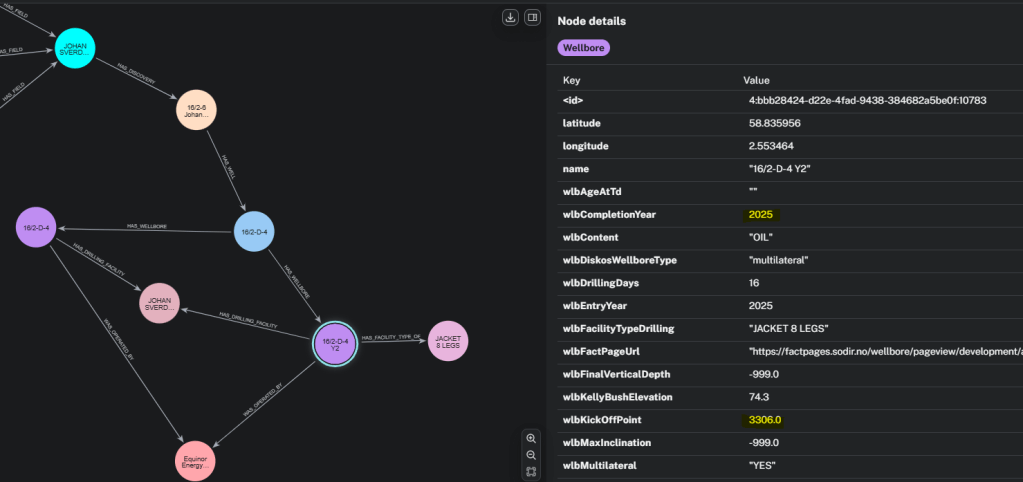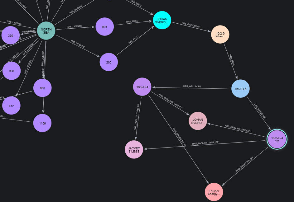 Traditional relational databases are great for structured records, but when it comes to exploring connections—for example, which operator managed a specific wellbore drilled from a facility in a given license area? – queries become complex and inefficient.